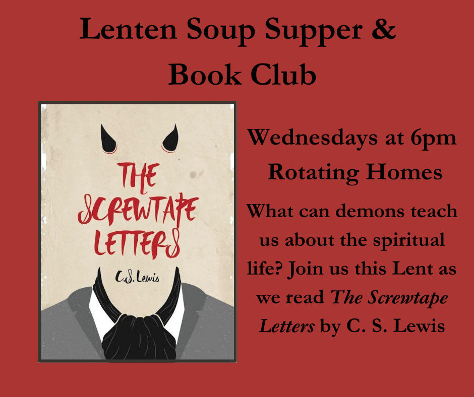 Join us on Wednesday evenings at 6pm during Lent as we gather in rotating homes for soup, fellowship, and conversation around The Screwtape Letters: Letters from a Senior to a Junior Devil by C.S. Lewis. The book is written as a series of fictional letters from a senior demon, Screwtape, coaching his nephew on how to tempt a human being, offering an insightful and often humorous look at the subtle ways temptation, distraction, and grace shape the Christian life.